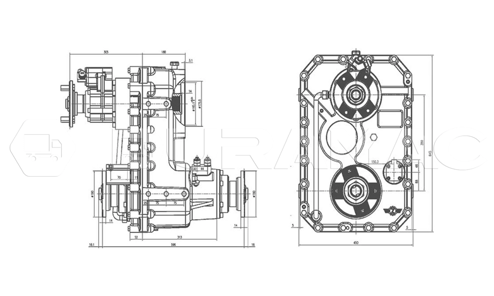 The ZQC4497 transfer case is tailored for concrete pump trucks and special applications. It features a maximum input torque of 32000 Nm for travel and 2200 Nm for pumping, a maximum input speed of 2700 rpm, and transmission ratios of 0.659 for mechanic drive and 1.00 for motor drive.