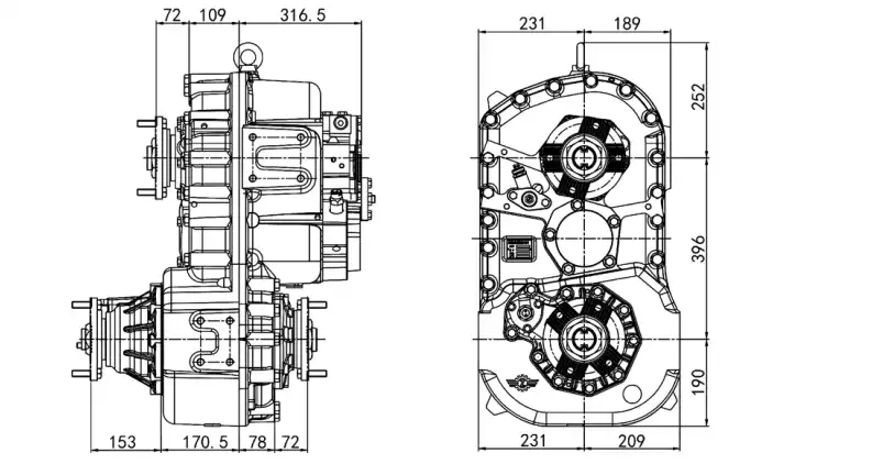 The ZQC2000L is a heavy-duty transfer case for wheeled vehicles, built to excel in demanding operations. It delivers a maximum input torque of 25000Nm and a maximum input speed of 2800rpm, with an input-output center distance of 396mm, ensuring reliable power transmission.